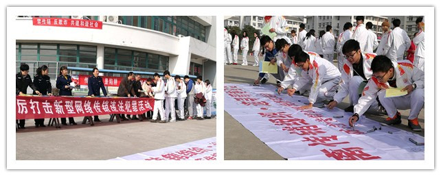 活动通过展板演示、反传销知识讲解和签名活动等形式,进行了相关法律法规知识的普及宣传,提高了广大学生对传销活动的识别能力和防范意识。下一阶段各系将组织召开主题团日活动,宣讲和学习《禁止传销条例》、《关于进一步做好查处网络传销工作的通知》等文件,组织学生观看宣传片《黑梦》,使同学们深刻认识到传销的危害,努力营造 “校园拒绝传销,师生远离传销”的校园环境。同时进一步加强校园内部监控管理,严防外来人员进校园、班级、寝室、社团进行宣传蛊惑及诱骗活动,坚决杜绝传销活动进入校园。