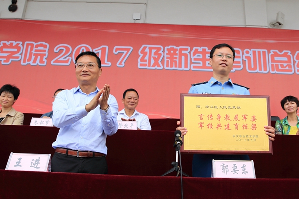 9月22日上午,我院2017级新生军训汇报表演暨总结表彰大会在学院运动场隆重举行。院党委书记王进出席并向承训部队赠送锦牌。副院长施运华、毕明生、谭维奇,军训团团长、迎江区人武部副部长郭要东出席。纪委书记方天祜主持大会。各系(部)及教务处、保卫处、学生处负责人,全体新生及辅导员参加大会。
