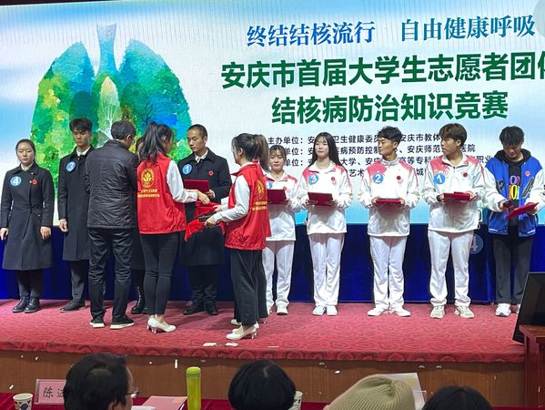 为纪念第26个世界结核病防治日,由安庆市卫生健康委员会、安庆市教体局主办的安庆市首届大学生志愿者团体结核病防治知识竞赛,3月23日下午在安庆师范大学龙山校区举行,参赛比赛的志愿者团体有:我校的健康有约协会、安庆师范大学大学生健康之家社团、安庆医药高等专科学校青年志愿者协会、安徽黄梅戏艺术职业学院红丝带结核病志愿者协会、桐城师范高等专科学校“启明心”青年志愿者协会。