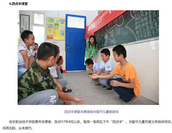 “四点半课堂”是指每周一至周五下午放学后,青年志愿者们为小学留守儿童开展义务陪伴活动,从课业辅导、心理辅导、安全教育、科学教育、素质拓展等方面为其成长提供多维度支撑。我校青年志愿者协会的这份创意和美好愿景得到社会各界大力支持,自20174月成立以来,为安庆市迎江区长风中心小学一百余名留守儿童提供义务服务,成为留守儿童心灵成长的好伙伴、学习路上的好伙伴、运动场上的好伙伴、兴趣培养的好伙伴。 (撰稿:闻胜海)