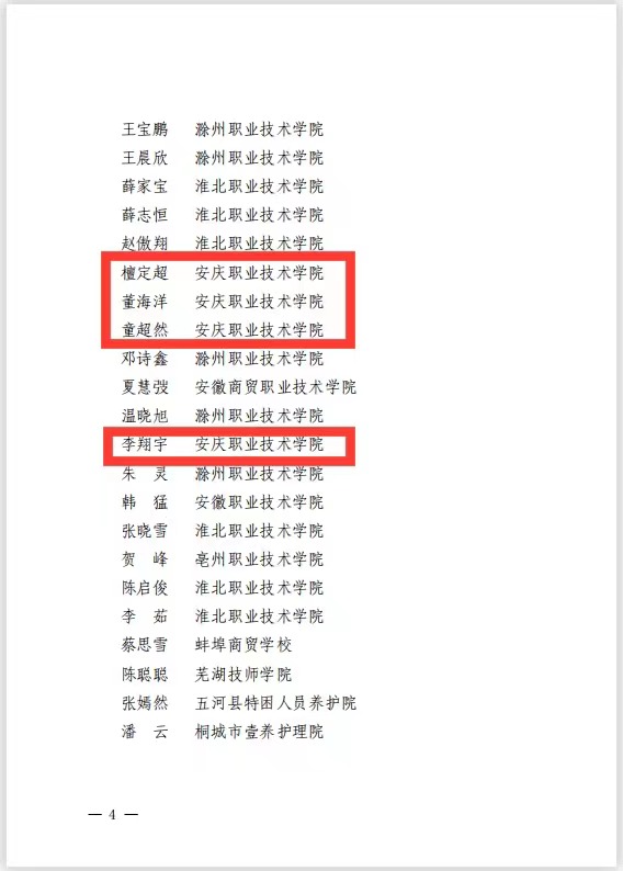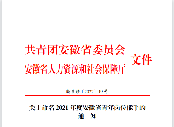 近日,共青团安徽省委员会、安徽省人力资源和社会保障厅印发了《关于命名2021年度安徽省青年岗位能手的通知》,我校檀定超、董海洋、童超然、李翔宇四位同学喜获2021年度“安徽省青年岗位能手”荣誉称号。
