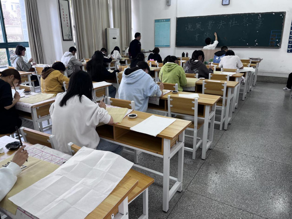 22级大一新生参加了这次比赛,在逸风书法社各部门干事的监督下,同学们用统一的逸风书法社提供的纸张,比赛中每一名学生都满怀激情,用心书写,他们握笔正确,坐姿端正,表现出良好的书写习惯,所写作品笔画流畅,整体美观,在短短的一个小时时间内涌现了一批佳作。
