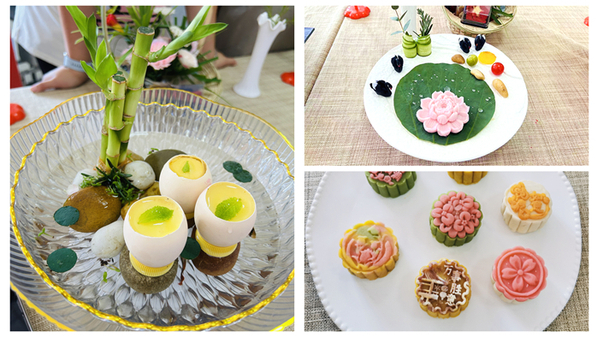 农林与服装学院以“繁荣昌盛 食美天下”为主题的食品展,由食品质量与安全专业和园艺技术专业的师生们耗时一周共同打造完成。食品专业展出的作品《荷塘月色》、《安庆印象》、《鱼戏莲间》,将中华人民共和国成立75周年主题、两大专业技能、中国传统文化、安庆地方特色等完美融合;园艺技术专业展出作品分为传统与现代两大模块:传统六大花器为基地,选用不同的花材,采用剑山和撒固定基板,对中国传统插花中的不同花器予以完美展示。现代插花作品在传承的同时,也从历史长河中汲取智慧,融入现代科技的创新精神,通过现代插花展现引领时代的潮流。该学院两大专业师生将第一课堂与第二课堂深度结合,协同育人,突出了校园美育文化的同时,也增强了同学们专业实践能力。