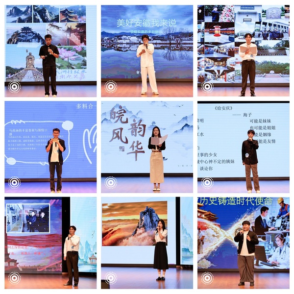 本次比赛以“美好安徽我来说”为主题,11位兼具表达能力与文化素养的选手从各学院选拔中脱颖而出,站上校级舞台,以饱满的热情展现了“青春安徽宣传员”的卓越风采。在主题宣讲环节,选手们以生动的语言、真挚的情感,从多元视角描绘出安徽的美丽风光、灿烂文化与蓬勃生机。有的聚焦壮丽山水,细腻勾勒黄山奇松的坚韧、怪石的嶙峋与云海的缥缈,仿佛将观众带入“天下第一奇山”的诗意长卷;有的深耕传统美食,从徽州臭鳜鱼的独到工艺到无为烤鸭的酥脆口感,娓娓道来间尽显人间烟火,引得满座回味无穷;有的倾情讲述地方戏曲,将黄梅戏的源流、唱腔与艺术魅力细细铺陈,让经典非遗在青春讲述中焕发新生;还有的聚焦科技创新,从新能源的突破到人工智能的应用,展现安徽在时代浪潮中勇立潮头的发展势头,令在场师生深切感受到家乡的奋进脉搏。