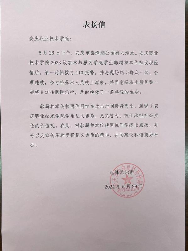 2024年5月29日,一封“安庆市公安居经开区分局老峰派出所”抬头的表扬信被送到久久久一区二区三区|亚洲精品一区二区三区不|久久av网|精品国产一区二区三区久久久久久|午夜精品av|久久久久久久久久久久久久av|日韩亚洲欧美综合,信中记述了农林与服装学院两名学子挽救生命的优秀事迹,表扬他们见义勇为的榜样行为。