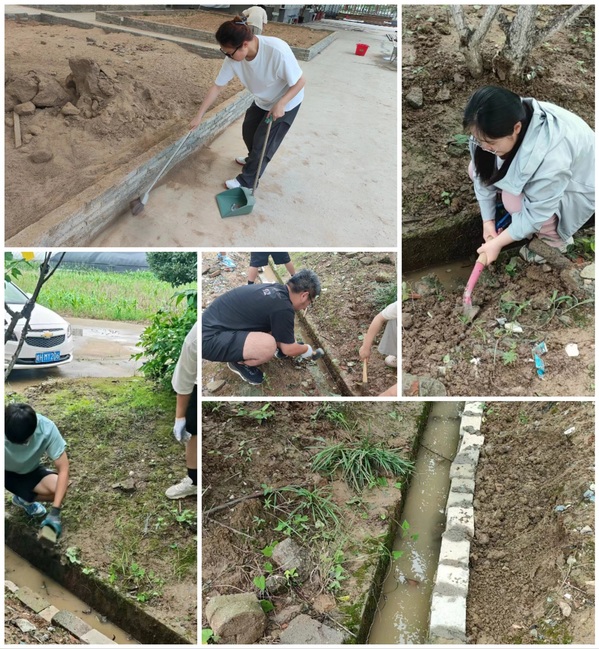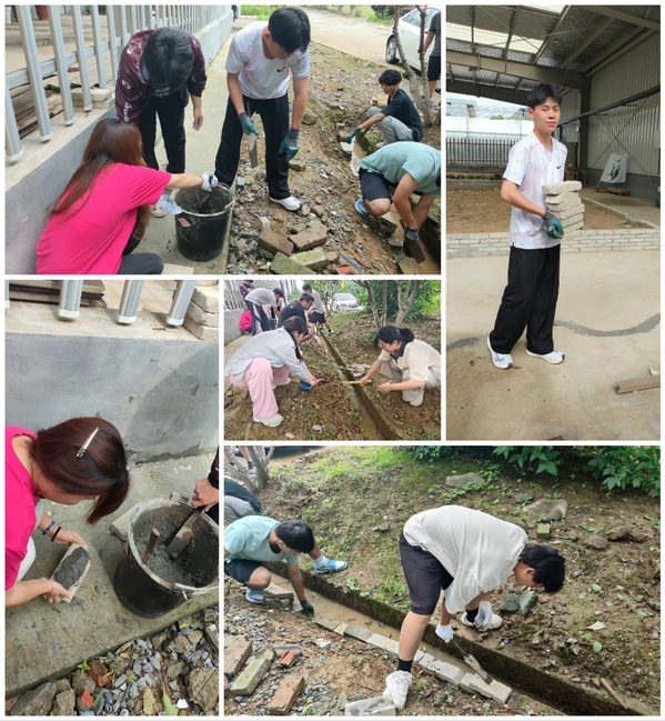 活动现场,学子们手持瓦刀、水泥桶等工具,分工明确,有条不紊地展开着维修工作,。有的学子细心检查大棚外围的墙面,精心修复每一处破损,加固每一处薄弱;有的则俯身清除四周的杂草和杂物,不放过任何一片落叶、一根枯枝;还有一群学子专注于水沟的清理,他们耐心清除沟内的淤泥和杂物,修砌塌陷处,确保水流畅通无阻。
