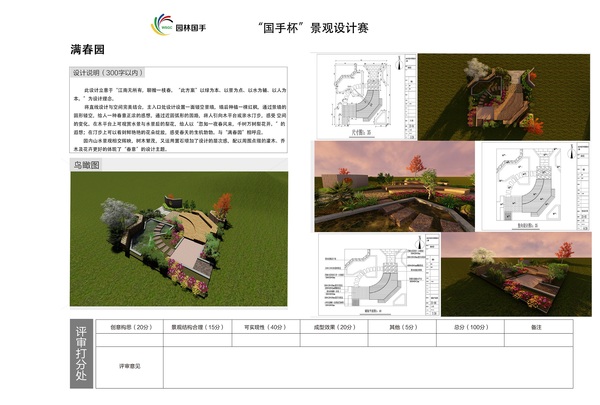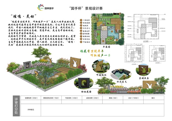 “国手杯”景观设计赛是一项具有重要意义的全国性赛事,由中国都市农业职业教育集团、中国农学会都市农业与休闲农业分会、北京市门头沟区军庄镇人民政府、北京绿京华生态园林股份有限公司联合主办。本次大赛以“人与自然和谐、共生”为主题,要求参赛选手充分利用地形、植物、水体、园林建筑物等构景要素,设计一处开放式生态庭院。铺装、砌筑、木作、水景、植物种植等各工序在设计中都需有所体现且相对均衡。