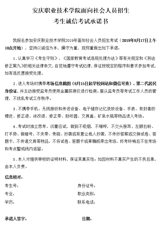扩招考生诚信考试承诺书